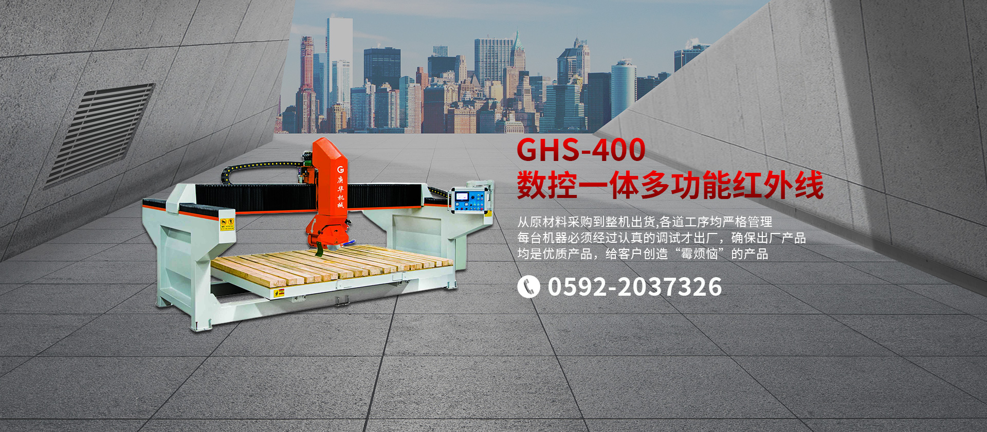 公司生產適用于大理石、花崗巖、砂巖、石灰?guī)r、洞石、玉石等各種石材的機械設備。主要產品有GHHW系列紅外線橋式切邊機、GHQQ系列橋式多片組合鋸石機、各種手動/自動/單頭/多頭板材磨拋機、以及各種異形加工設備。公司長期注重品質管理,以質量為中心,從原材料采購到整機出貨,各道工序均嚴格管理,每臺機器必須經過認真的調試才出廠,確保出廠產品均是優(yōu)質產品,給客戶創(chuàng)造“零煩惱”的產品。